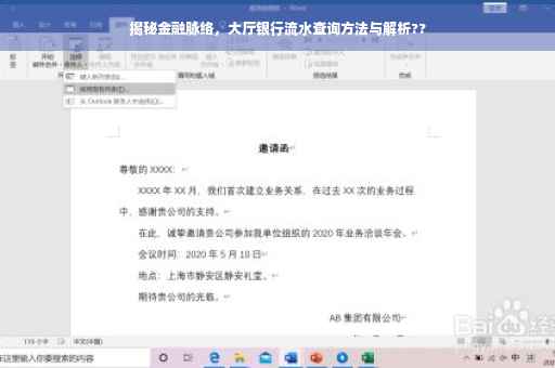 摘要:本文将介绍如何查询大厅银行的流水,通过简单步骤揭示金融世界的脉络。读者将了解如何获取个人银行账户的详细交易记录,包括交易时间、金额等信息。本文旨在帮助公众更好地管理个人财务,了解银行流水的查询方法,以便更好地掌握自己的金融状况。