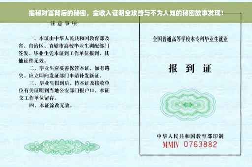 摘要:本文将揭示鲜为人知的金收入证明背后的秘密故事,带你了解财富背后的真相。本文将介绍如何开具金收入证明,包括需要注意的细节和步骤,帮助你更好地掌握财富增长的秘诀。阅读本文,你将了解到更多关于财富的秘密,为你的未来财富积累提供有益的启示。
