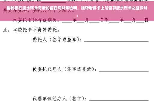 随着经济的飞速发展和个人财务的日益复杂化,银行流水账单已经成为众多家庭关注的焦点,它不仅仅是一张简单的交易记录,更是家庭财务健康与否的重要体现,在这一过程中,银行流水账单与夫妻关系的微妙关系逐渐受到人们的关注,我想与大家分享我与丈夫对于银行流水账单的看法及在日常生活中的实际应用,并探讨信任与家庭财务透明的重要性。