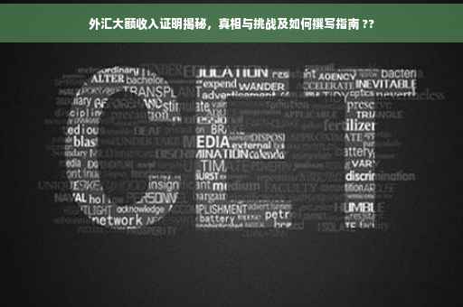 摘要:本文将介绍外汇大额收入证明的重要性及其背后的真相与挑战。通过深入了解如何撰写外汇大额收入证明,揭示其中可能存在的难点和问题,帮助读者更好地理解和应对外汇收入证明的相关问题。本文将涵盖撰写证明时需要注意的关键点,包括格式、内容以及必要的细节等。