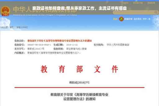 家政类的证书很多,我知道的主流证书有人社部颁发的、家协颁发的和中成协颁发的不过目前人社部几乎不颁发家政类职业能力证书了,现在市场上很多都是假证,网上查不到;你可以搜一下中国成人教育协会的证书,或者去当地机构看一下,这个证书在教育部网站可以查到,好像是跟国开学分银行对接,会发相关证明。