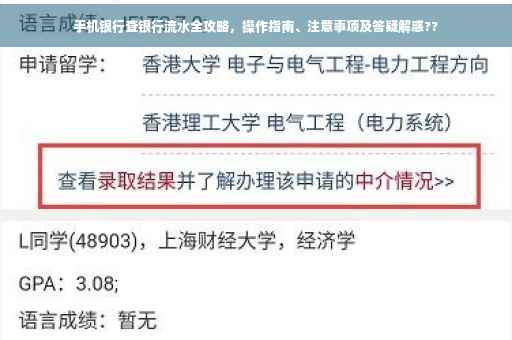 摘要:本文将为你提供手机银行查银行流水的全攻略,包括详细操作步骤、注意事项以及常见问题解答。通过简单的操作,你可以轻松在手机上查询银行流水,省去了排队等待的时间。本文还将提醒你需要注意的事项和解答你可能会遇到的问题,帮助你更好地管理个人财务。