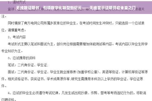 无线数证明书是一个证明个人或企业在无线通信技术领域具备专业能力的证书,随着科技的飞速发展和数字化时代的到来,无线技术在各个领域得到了广泛应用,无线数证明书作为衡量数字化能力的重要标准,其地位日益凸显。