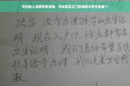 摘要:农村收入证明贷款是农民实现致富的重要途径。通过撰写农村收入证明贷款,农民可以展示其经济状况和收入来源,以此作为贷款的资质证明。本文将介绍如何撰写农村收入证明贷款,包括收入状况、收入来源、贷款目的等要点,帮助农民顺利获得贷款,开启致富之门。这把金钥匙将助力农民实现经济独立和发展,改善农村生活。