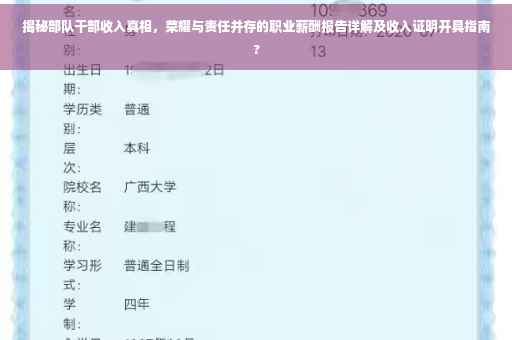摘要:,,本报告将揭示部队干部的真实收入证明,这是一份荣耀与责任并存的职业薪酬报告。部队干部的收入证明包括基本工资、津贴补贴以及奖励等多个方面。开具收入证明需要遵循一定的程序,包括向所在单位财务部门提出申请,提供相关证件和资料,经过核实后开具收入证明。作为部队干部,他们承担着保卫国家和人民安全的重任,其收入证明体现了对这一职业尊重和认可。