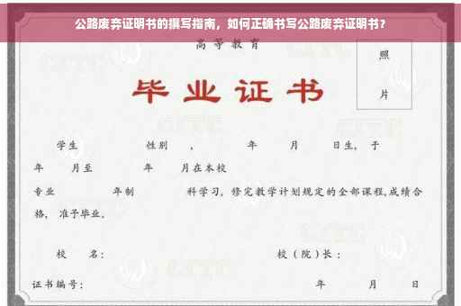 摘要:本文介绍了公路废弃证明书的撰写方法。公路废弃证明书是用于证明某条公路已经废弃不再使用的文件。在撰写时,应明确说明公路的名称、位置、废弃原因及时间等关键信息,以确保信息的准确性和完整性。本文旨在帮助读者了解如何规范地编写公路废弃证明书,以便相关部门和单位能够及时处理废弃公路的相关事宜。
