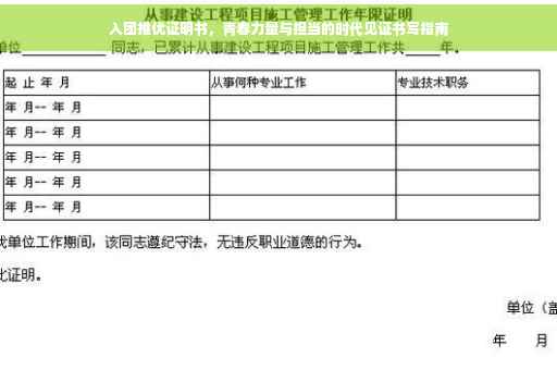 摘要:入团推优证明是记录青春力量与担当的时代印记的重要文件。它旨在证明个人在团队中的优秀表现和突出贡献,体现了个人的责任感和使命感。撰写入团推优证明时,应突出个人的思想品格、学习工作表现、团队协作能力及社会贡献等方面。内容应简洁明了,客观真实,以展现个人的优秀素质和团队的价值。