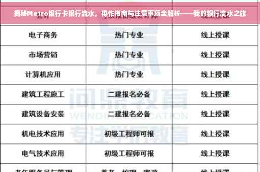 随着科技的快速发展,越来越多的人开始使用银行卡进行日常消费和转账,Metro银行卡作为一种常见的支付工具,其银行流水账单对于个人财务管理至关重要,本文将详细介绍如何查询Metro银行卡银行流水,以及在此过程中需要注意的事项。