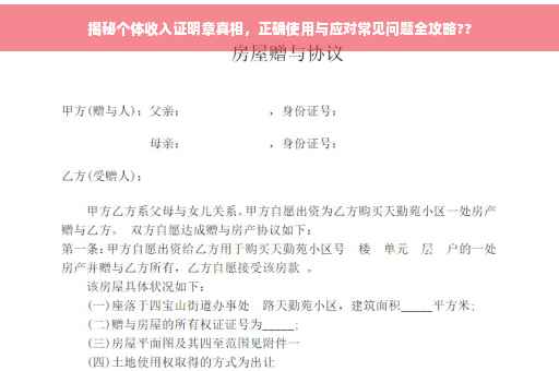 摘要:本文将揭示个体收入证明章的真相,指导读者如何正确使用并应对常见问题。文章将介绍个体收入证明章的盖章流程,包括注意事项和常见问题解答。通过本文,读者可以更好地了解个体收入证明章的重要性,以及如何确保其真实性和有效性。