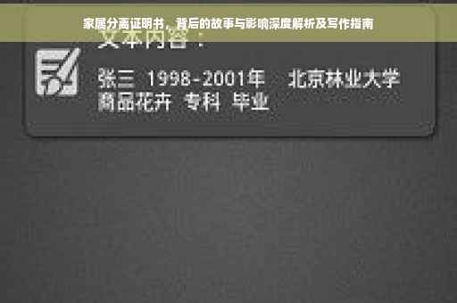 摘要:本文将介绍家属分离证明书的概念及其背后的故事与影响。通过深度解析,让读者了解家属分离证明书的撰写方式及其重要性。文章将探讨家属分离的原因、影响以及如何书写证明书,包括证明书中应包含的关键信息。通过本文,读者可以更好地理解家属分离证明书的实际应用及其对个人和家庭产生的深远影响。