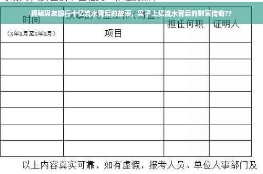 男友银行十亿流水背后的故事引人关注。据悉,一名男子在银行拥有上亿的流水记录,背后隐藏着不为人知的故事。这段经历或许充满艰辛与奋斗,也或许涉及到金融世界的复杂与神秘。关于这段故事的具体细节尚未透露,引发了人们的好奇与猜测。