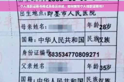 摘要:,,本文介绍了个人挂职证明书的格式及详细经历阐述的方法。个人挂职证明书格式应包含标题、正文、署名和日期等基本信息,正文部分需详细阐述个人挂职的时间、地点、单位、职务以及具体工作内容和成果等。文章还提供了如何清晰明确地阐述个人挂职经历的细节,包括所面临的挑战、所取得的成就以及个人成长等。让读者了解如何正确书写个人挂职证明书并充分展现自己的经历和能力。