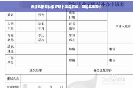 摘要:本文将探讨疾病休假证明书与疾病诊断证明书之间的差异与重要性。疾病诊断证明书主要用于确认患者所患疾病,为后续治疗提供依据;而疾病休假证明书则是在患者确需休息时,由医生开具的证明文件,用以证明患者因病无法正常工作或学习。两者虽有所不同,但都对患者的治疗与恢复起到关键作用。理解两者的差异,有助于保障患者的权益,促进康复。
