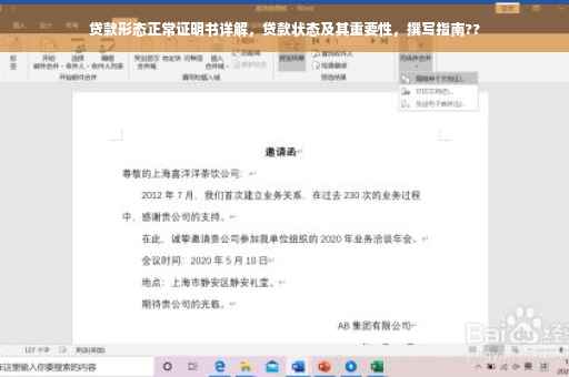 摘要:贷款形态正常证明书是用于证明贷款状态正常的文件,对于借款人而言十分重要。通过此证明书,借款人可以了解贷款状态,包括还款情况、贷款余额等。本文介绍了如何撰写贷款形态正常证明书,并强调了其重要性。正确地了解和掌握贷款状态,有助于借款人做出合理的财务规划,维护个人信用记录,确保贷款顺利还清。
