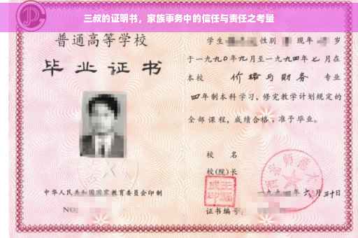 在一个普通的家庭里,三叔作为家族长辈之一,深受家人的尊敬和信任,他为人正直善良,处事公正无私,家族成员在遇到问题时常常寻求他的帮助,这次,家族中的一项事务需要他出具证明书,以证明某件事情的真实情况,面对这个任务,三叔毫不犹豫地承担了下来,展现出了他的责任心。