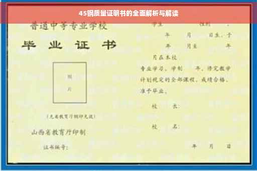 摘要:本文全面解析了关于45钢的质量证明书内容。详细介绍了质量证明书的构成,包括产品规格、生产工艺、化学成分、机械性能等重要信息。通过解析质量证明书,帮助读者了解如何评估45钢的质量,确保选购到符合标准的优质钢材。本文旨在为需要购买或使用45钢的读者提供有价值的参考信息。