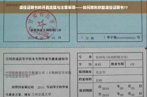退役证明书的开具流程包括提交相关证件和资料至当地退役军人事务部门,填写申请表格并经过审核后领取证明书。注意事项包括确保提供的证件和资料真实有效,填写申请表格时要准确无误,遵守规定的时间和程序,及时领取证明书。开具退役证明书是对退役军人的一种尊重和认可,也是其荣誉的象征。??开具退役证明书需提交证件至当地退役军人事务部门,填写申请表格并审核通过后领取。确保资料真实有效,遵守规定程序,及时领取。这是对退役军人的尊重和荣誉认可。