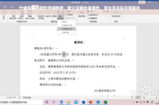 摘要:本文将探讨个体与部门间的联系桥梁,重点解析收入证明的重要性及实际应用。文章将指导读者了解收入证明的作用,包括在职业发展和财务管理中的关键作用,以及撰写收入证明的基本要点和注意事项。通过深入理解收入证明的写作要点,个体能更好地与部门沟通,提高职业竞争力,实现个人与组织的共同发展。