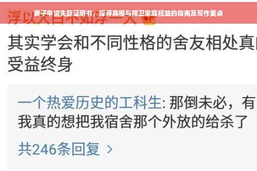 妻子申请失踪证明书是一场艰难的过程,但为了保护自身权益和家庭和谐,申请人需勇敢面对困境,在申请过程中,确保及时报案、充分准备材料、咨询法律专业人士等注意事项的落实,将有助于顺利获得失踪证明书,我们也要尽一切可能寻找失踪者,让她们回到家庭,重拾幸福。