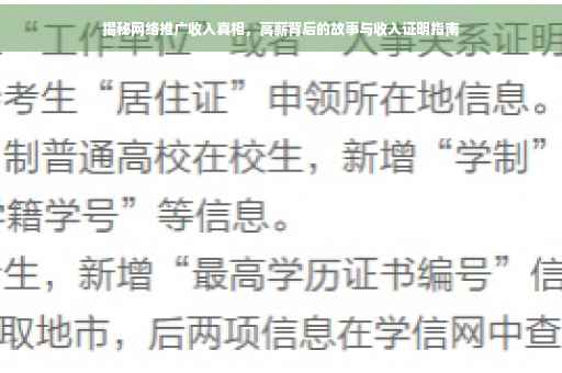 摘要:本文揭示了网络推广收入的真相,探讨了高薪背后的故事。想要证明网络推广收入,需要了解如何开具收入证明。本文将为你揭示这一过程的细节,帮助你了解如何有效地进行网络推广并获取相应的收入证明。通过阅读本文,你将了解到网络推广的真相以及获取收入证明的方法。