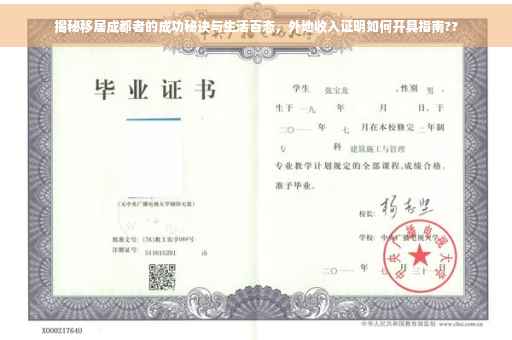 摘要:本文将探讨成都外地收入证明的开具方法,同时揭示移居者的成功秘诀与生活百态。通过深入了解移居者在成都的生活经历、工作状况以及收入证明的重要性,揭示他们如何在新的城市环境中适应并取得成功。本文还将介绍如何开具有效的外地收入证明,帮助读者更好地融入成都生活并把握发展机遇。