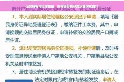 摘要:本文将深度解析按揭银行转账流水,包括其含义、作用及重要性。提供详细的操作指南,指导读者如何查询按揭银行转账流水。内容涵盖查询流程、注意事项及常见问题解答,帮助读者轻松掌握查询技巧,确保信息安全与准确性。阅读本文,将帮助您更好地管理财务,确保按揭贷款顺利。