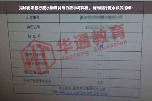 摘要:本文将探讨离婚时涉及银行流水额度的话题,揭示背后的故事与真相。文章将介绍离婚银行流水额度的概念,分析其在离婚案件中的重要性,并探讨如何确定具体的额度。文章旨在帮助读者了解离婚银行流水额度的相关知识和真相,避免误解和不必要的纷争。,,(字数约150字)