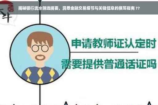 摘要:银行流水筛选摘要对于洞悉金融交易细节与关键信息至关重要。撰写时,应清晰列出筛选目的、流水账号及时间段,概述交易类型、金额及流向。重点标注异常交易、大额进出及频繁交易等关键信息,以便快速掌握资金流动情况。摘要应简洁明了,突出重点,便于快速了解银行流水的核心内容。