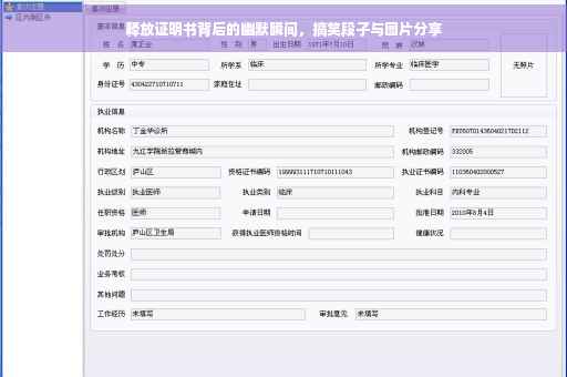 摘要:释放证明书背后的搞笑瞬间成为网络热门话题。一些有趣的释放证明书段子配以图片,引发网友热议。这些搞笑的瞬间展现了人们在严肃场合也能找到乐趣的一面,释放证明书不再只是严肃的正式文件,而是成为网友们发挥创意和幽默的舞台。通过分享这些搞笑图片,人们在轻松愉快的氛围中传递正能量。