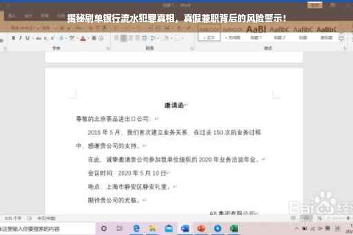 摘要:本文揭露了刷单银行流水背后的犯罪真相,探讨了所谓的刷银行流水兼职的真假问题。提醒公众警惕这种看似诱人的兼职背后可能隐藏的陷阱,包括个人信息泄露、经济损失等风险。呼吁大家提高警惕,远离非法活动,保护自身财产安全。