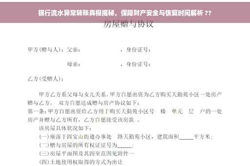 摘要:银行流水出现异常转账情况,需引起重视并揭开真相,以保障个人及他人的财产安全。关于异常转账的恢复时间,因具体情况而异。一旦发现问题,应立即联系银行并咨询解决方案。为保障资金安全,切勿忽视银行流水异常,及时采取措施是关键。