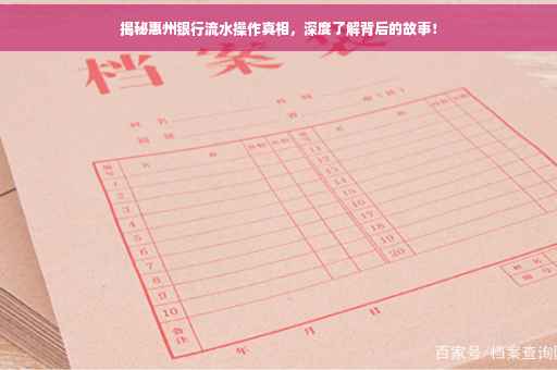 随着金融行业的不断发展,越来越多的人开始关注个人银行账户的流水操作,特别是在惠州这座美丽的城市,银行流水操作更是备受关注,本文将详细介绍惠州银行流水操作的相关知识,带你了解其中的细节和注意事项,帮助你更好地管理个人财务。