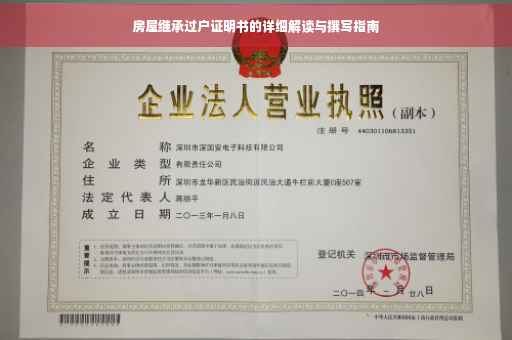 摘要:本篇文章将详细介绍房屋继承过户证明书的撰写过程。文章内容包括如何准备相关材料、证明书的格式要求、填写时需要注意的事项等。通过本文,读者可以了解到如何正确书写房屋继承过户证明书,以便顺利完成房屋继承过户手续。摘要字数控制在100-200字以内。