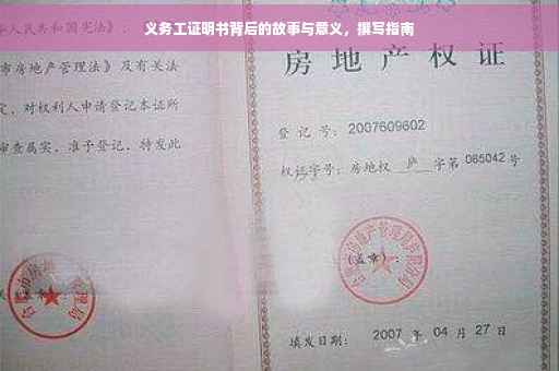 摘要:本文将介绍义务工证明书的重要性及其背后的故事与意义。通过本文,您将了解如何撰写义务工证明,包括证明的目的、内容、格式等细节。本文将提供实用的指导和建议,帮助您准确、清晰地表达义务工作的经历和价值,从而充分发挥义务工证明书的作用。