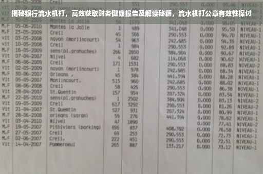 摘要:银行流水机打是获取个人财务健康报告的重要途径。通过高效操作,可以轻松获取并解读流水账单。需要注意流水机打出的公章是否真实有效,以确保账单的正规性。了解这些技巧有助于更好地管理个人财务,做出明智的金融决策。