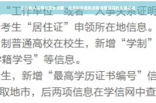 摘要:本文将详细介绍工行收入证明和流水证明的概念及其区别,阐述它们对于个人财务透明度和信誉保障的重要性。通过了解收入证明和流水证明的不同内容和使用场景,读者可以更好地了解自己的财务状况,提升个人信用度,为未来的财务规划提供有力支持。工行收入证明和流水证明在财务管理中扮演着重要角色,是个人经济生活中的必备文件。