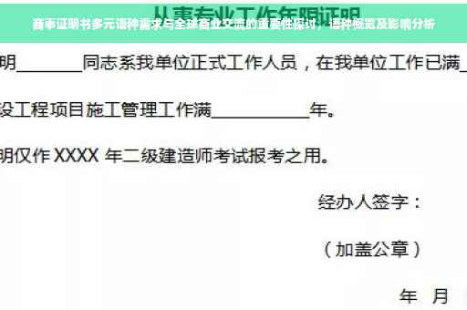 在全球化的背景下,商事活动跨越国界,涉及多种语言和文化的交流,商事证明书的语种需求也日益多样化,无论是国际贸易、跨境投资、经济合作还是企业间日常业务往来,不同语种的商事证明书都确保了信息的准确传递和业务的顺利进行,英语、中文、法语、西班牙语、阿拉伯语等语言在全球商事活动中扮演着重要角色,掌握这些语种的商事证明书对于企业的国际化发展至关重要。