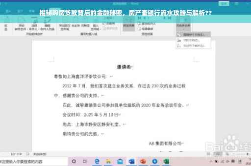 摘要:本文将介绍如何通过查银行流水来深入了解房产购房贷款背后的金融秘密。通过查询银行流水,可以了解购房者的资金状况、贷款申请的真实性以及可能存在的风险。本文将简要介绍查银行流水的方法和步骤,帮助购房者揭开金融秘密的面纱,更加明智地做出决策。