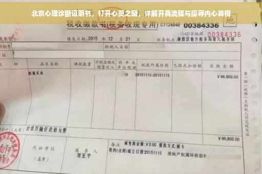北京心理诊断证明书是了解个体心理状态的重要途径,通过心理诊断证明书,我们可以为治疗提供科学依据,解决涉及心理健康的法律纠纷等问题,让我们关注心理健康,打开心灵之窗,探寻内心真相。