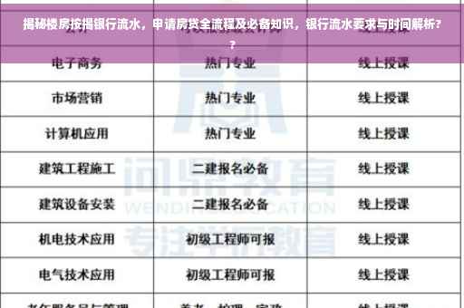 摘要:本文将揭秘楼房按揭银行流水的申请流程与必备知识,包括银行流水的重要性及其在申请房贷时的具体要求。读者将了解银行流水应涵盖的时间范围,以及如何利用银行流水成功申请房贷。本文旨在帮助购房者顺利办理房贷,避免不必要的困扰。
