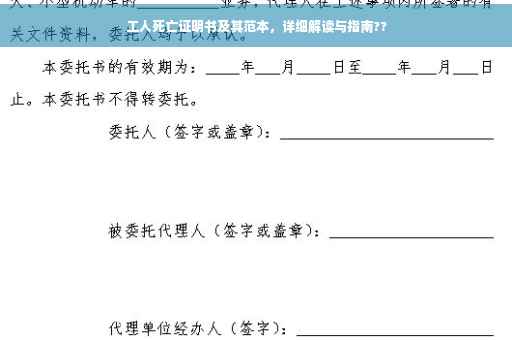 摘要:本文介绍了一份工人死亡证明书的范本,该范本可作为参考,用于证明工人因工作或其他原因不幸身亡的情况。该证明书应包含必要的信息,如工人姓名、年龄、职业、死亡时间、地点和原因等,以提供正式和准确的证明文件。这份证明书对于处理相关事宜和解决争议具有重要意义。