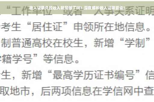 收入证明只拉收入是不够的,虽然收入是评估个人经济状况的重要指标,但其他证明材料同样重要,在实际情况中,一份有效的收入证明应该真实、准确、完整,反映个人的全面收入状况,其他证明材料如学历证明、社保缴纳证明、资产证明等也能在多个场合发挥重要作用,在准备收入证明时,我们应该关注全面的证明材料,而不仅仅是拉高收入数字。
