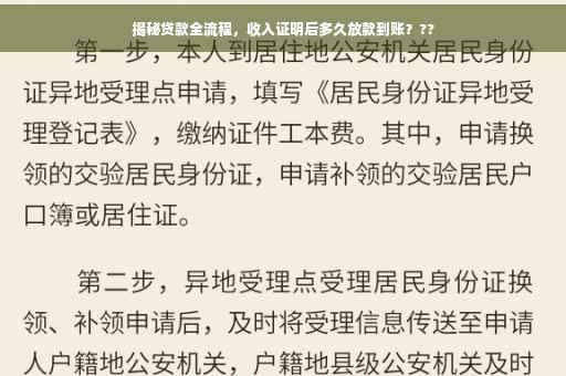 在当今社会,贷款已成为人们实现各种需求的一种常见方式,无论是购房、购车还是创业,贷款都能为我们提供资金支持,许多人在申请贷款时,对于整个流程及其细节并不十分了解,本文将详细介绍收入证明后多久放款的问题,并带你了解贷款全流程。