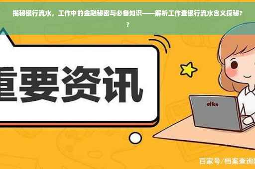 摘要:本文将揭示银行流水的重要性及其在工作中的金融秘密与必备知识。通过解析银行流水概念,帮助读者了解工作中查银行流水的含义,包括其作为个人或企业经济活动的记录,以及其在贷款、信用卡申请等方面的作用。掌握银行流水知识有助于更好地管理个人财务和做出明智的金融决策。