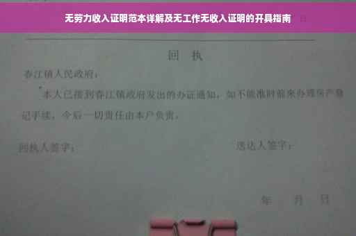 摘要:本文将详细介绍无劳力收入证明范本的使用,针对没有工作或收入的人群,解释如何开具无收入证明。文章将涵盖证明的重要性、适用范围、具体开具步骤和注意事项,帮助读者了解并正确运用无劳力收入证明,解决生活中的实际需求。