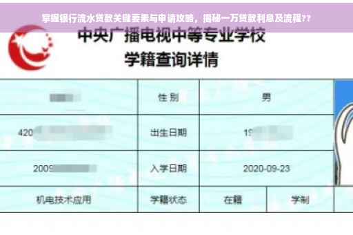 摘要:本文将为你揭秘申请一万银行流水贷款的关键要素和申请攻略。从流水要求、信用评估标准到利率计算等方面,全方位解析贷款申请流程。还将介绍如何优化申请流程,提高贷款成功率。阅读本文,让你轻松掌握银行流水贷款申请技巧,助你顺利获得贷款,解决资金问题!