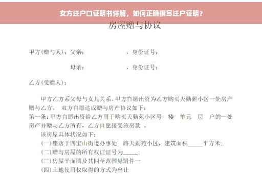 摘要:女方迁户口证明书是关于女方户籍变动的官方证明文件。其内容包括女方基本信息、迁移原因、迁移目的地等。撰写时需注意格式规范,清晰明了。证明书的写作应准确描述女方的身份信息、迁移原因及时间,并加盖相关户籍管理部门公章,以确保证明的有效性。一般要求内容简洁明了,字数控制在100-200字以内。