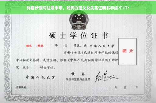 摘要:,,想要办理父女关系证明书,需遵循一系列详细步骤。准备相关证件如身份证、户口本等。前往当地公证机关或户籍所在地派出所提出申请。填写申请表格时,信息需真实完整。提交申请后,注意保持电话畅通以便联系。办理过程中还需注意核实证明书的真伪,确保法律效力。遵循这些步骤和注意事项,可顺利办理父女关系证明书手续。