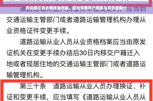 摘要:本篇攻略详细介绍了如何查询青岛银行流水,包括流水明细的获取方法和真伪辨别技巧。通过简单步骤,轻松掌握账户流水情况,确保财务安全。青岛银行流水查询攻略,助您轻松管理个人财务。