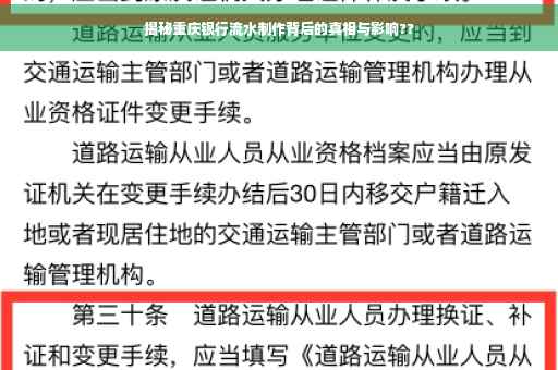 摘要:本文将揭示重庆包装银行流水的真相及其背后的影响。通过深入了解,发现银行流水制作的重要性及其可能存在的风险。我们将探讨这一现象背后的原因,并强调合规操作的重要性,以确保金融市场的稳定和透明。